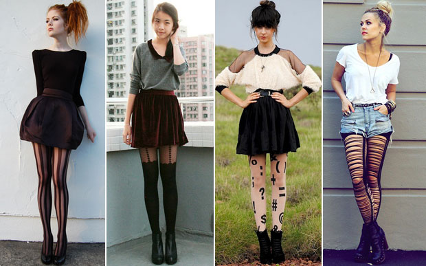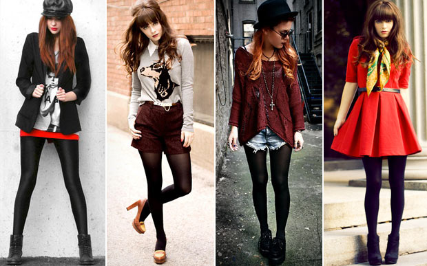 Aqui as opções são vááárias. Poá, corações, listras, renda... Como a meia já tem textura, o ideal é combiná-la com peças mais lisas, ok? Lembre-se também de que estampas grandes tendem a engrossar a perna. Caso este não seja seu objetivo, vá nos desenhos menores. Outro truque legal é rasgar a meia preta comum e montar uma produção mais detonadinha.